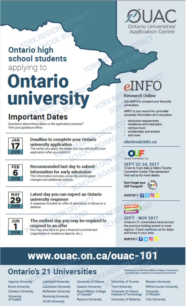 - 2018年1月17日:OUAC申请递交的截止日期 Deadline to submit your completed application to the OUAC.